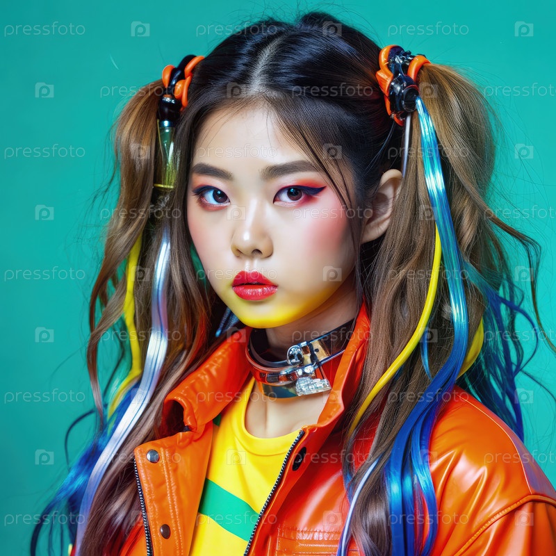 Корейская девушка с яркими слоистыми волосами позирует на зеленом фоне