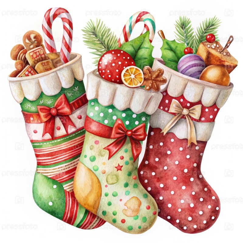 Красочные акварельные рождественские чулки, наполненные угощениями и праздничными украшениями для радостного торжества