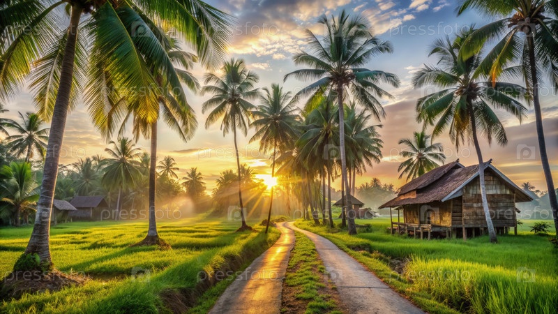Спокойная трасса для бега через пальмы при восходе солнца в тихом пейзаже