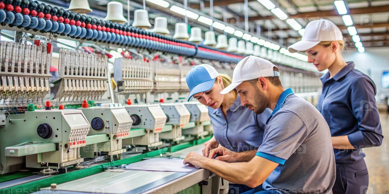 Люди работают вместе над вышивкой шапок в текстильной мастерской, используя стандартные методы