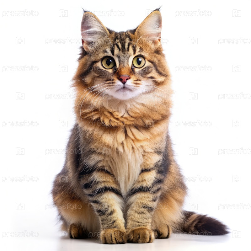 Любопытный кот с поразительным мехом сидит на чистом белом фоне, демонстрируя свою яркую личность и игривую природу