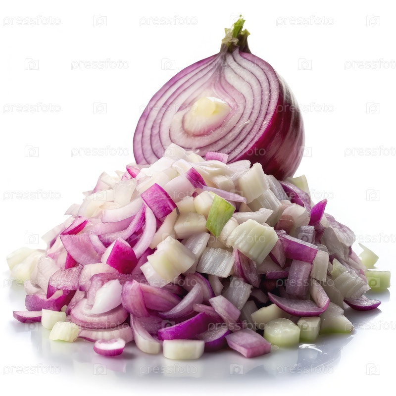 Нарубленный лук расположен в куче с половинчатым луком, помещенным рядом на белой поверхности, демонстрируя свою свежую текстуру и яркие цвета при естественном освещении