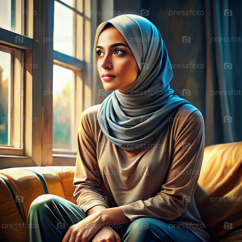 Красивая женщина в хиджабе, сидящая у окна под мягким дневным светом