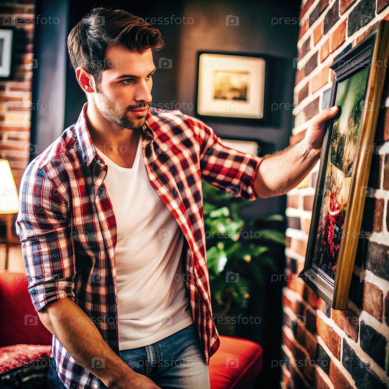 Красивый мужчина в квадратной рубашке изучает произведения искусства в уютной гостиной