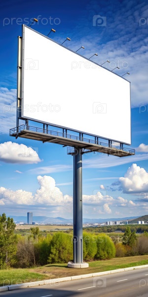 Большой пустой рекламный щит на фоне ярко-синего неба и пушистых облаков, расположенный вдоль живописной шоссе рядом с спокойным пейзажем