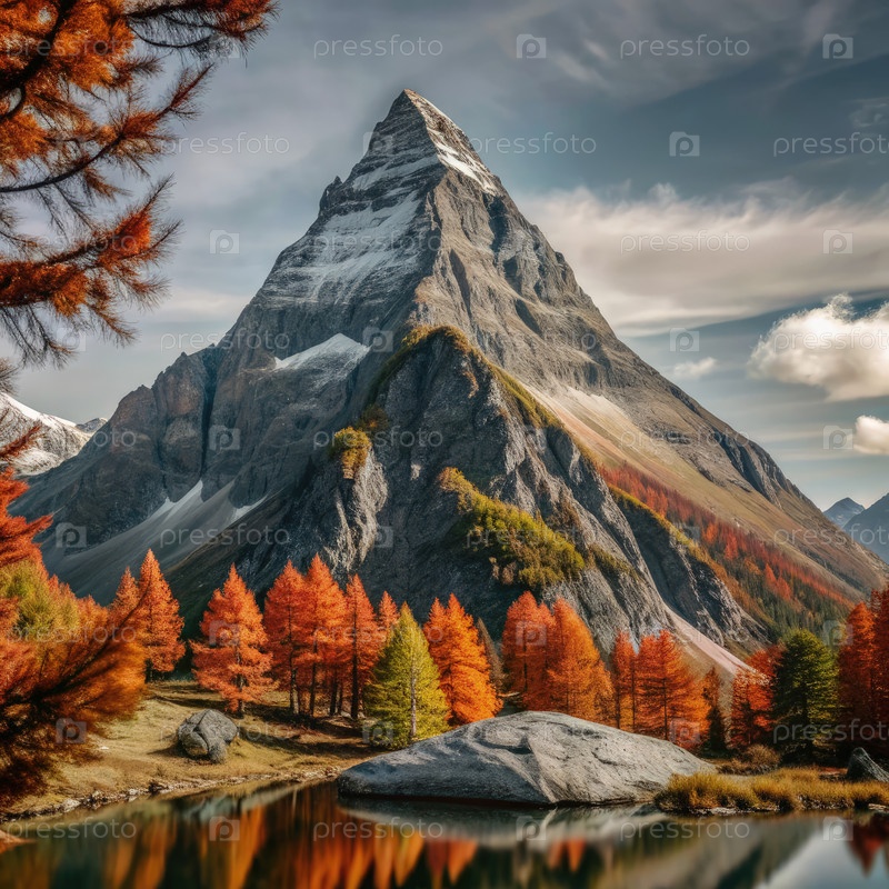 Величественный горный пик, окруженный осенними листьями и спокойными отражениями озера