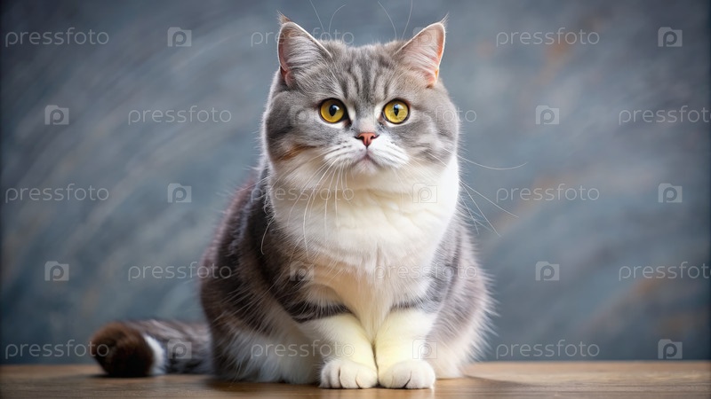 Серо-белый шотландский гетерактный кот восхитительно позирует на деревянной поверхности против мягко размытого голубого фона дома во второй половине дня