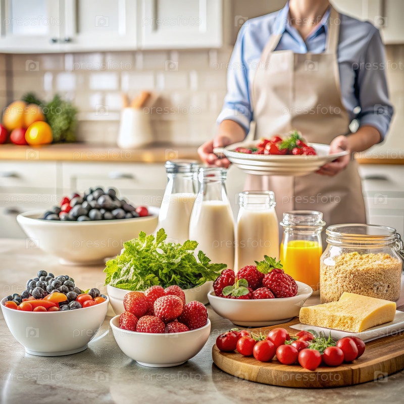 Свежие фрукты и молочные продукты расположены на мраморной кухонной столешнице