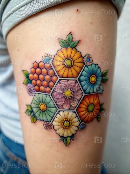 Деликатная цветовая гептагонная татуировка, демонстрирующая яркие цвета на верхней части руки в художественном изображении