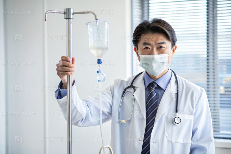 Азиатский врач проводит внутривенное лечение в современной больничной палате в дневное время