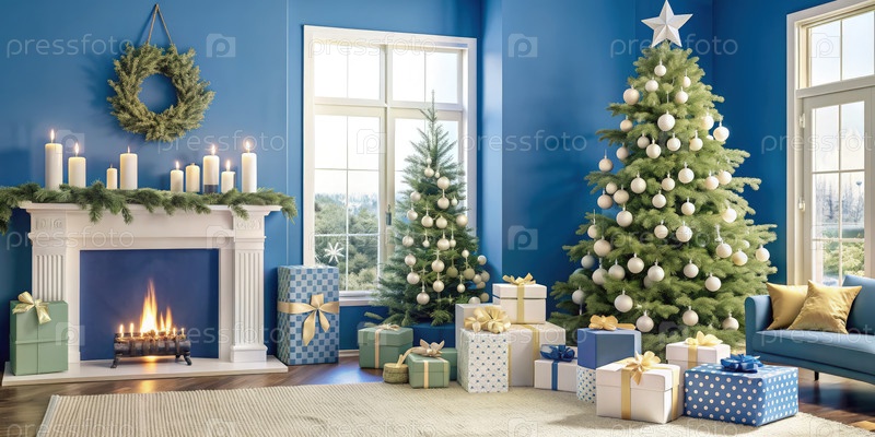 Красиво оформленная гостиная с двумя рождественскими елками, теплым камином и множеством красочных подарков создает праздничную атмосферу