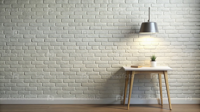 Минималистская стена из белого кирпича с лампой и столом, на которых изображено растение в горшке