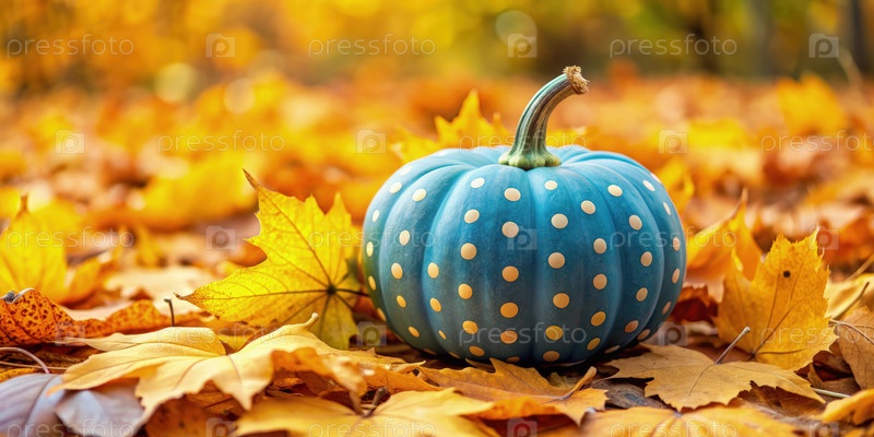 Синяя тыква с оранжевыми точками сидит на стандартной шкале среди красочных осенних листьев в безмятежной окружающей среде