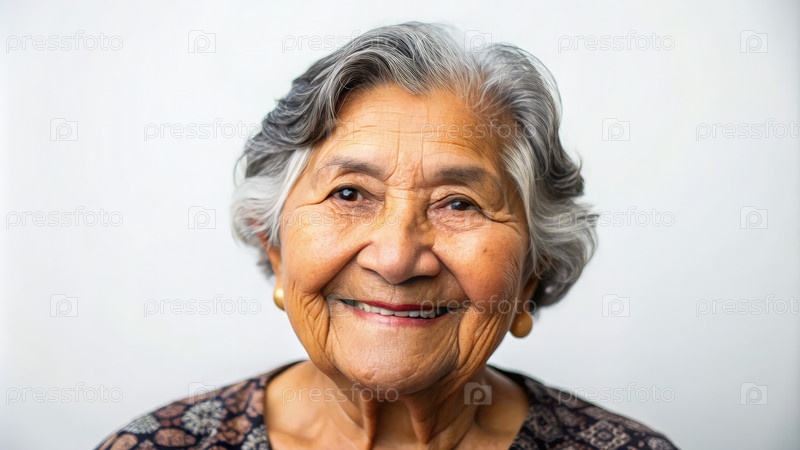 Пожилая испаноязычная женщина тепло улыбается камере в яркой помещенной обстановке, демонстрируя свое радостное выражение лица и энергичную личность