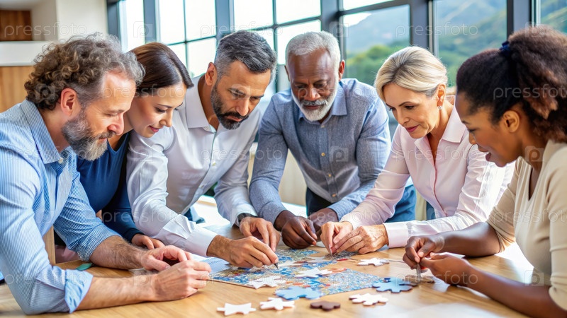 Профессионалы сотрудничают над решением головоломок в современном офисном помещении во второй половине дня