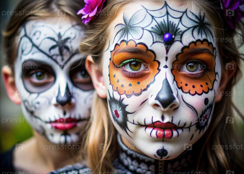 Близкий взгляд на рисунок лица Хэллоуина со сложными узорами и красочными акцентами во время праздничного торжества