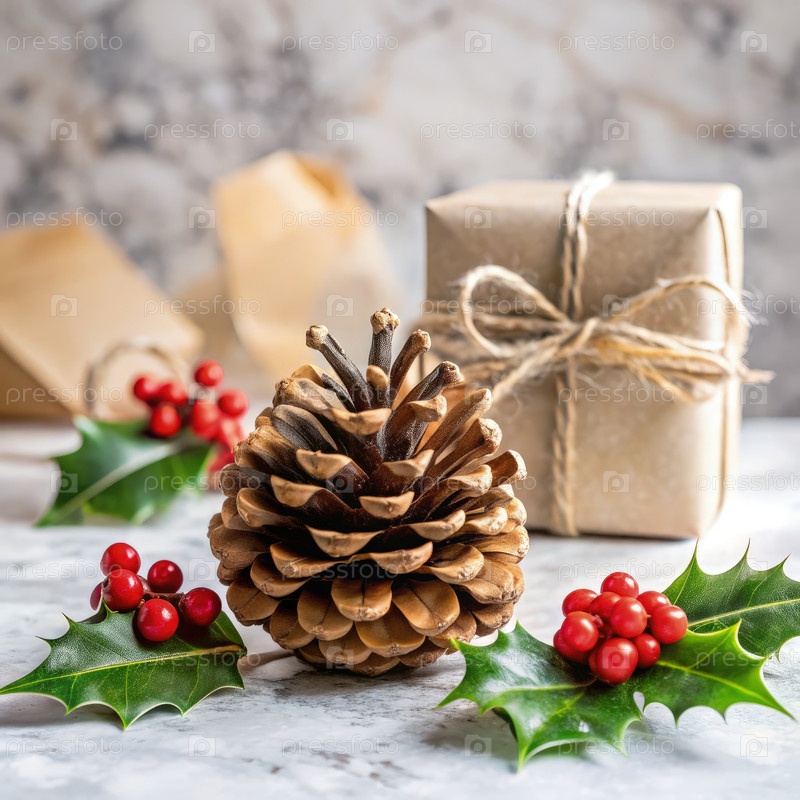 Сосновый конус, украшенный ягодами и подарочными пакетами для праздничного декора