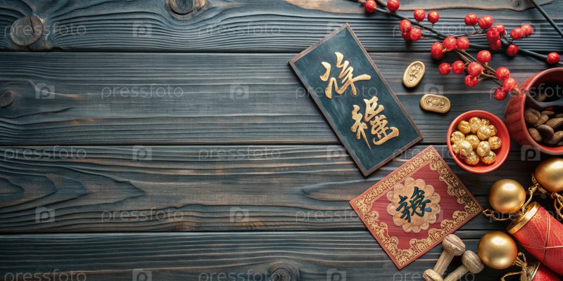 Лунный Новый год лежал с декорациями и традиционными угощениями на деревянном столе