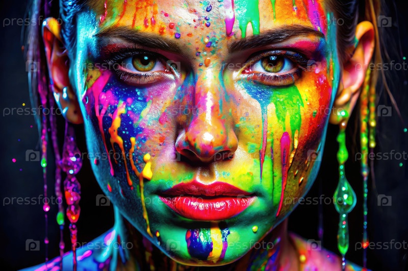 Близкий план лица женщины, украшенной яркой краской в творческом искусстве