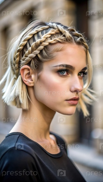 Модная короткая блондинка с пряжами на модной городской улице
