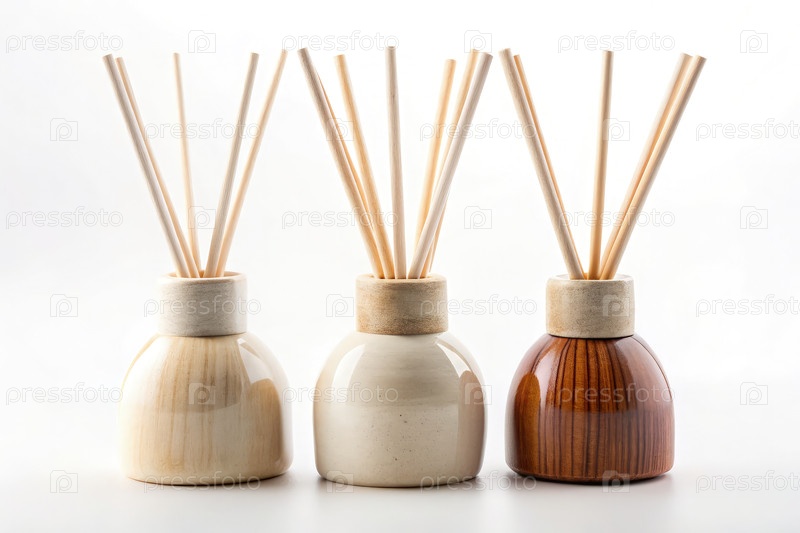 Три керамических бутылки с деревянными тростниками, расположенные на белом фоне