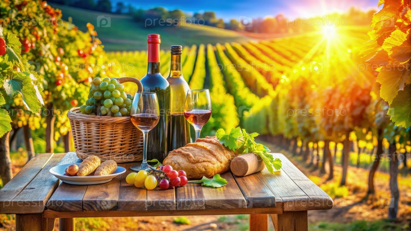Деревянный стол с вином и едой в винограднике на закате