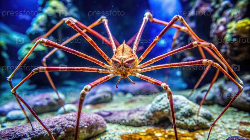 Краб стрелы, ориентирующийся в скалистой среде обитания аквариума днем