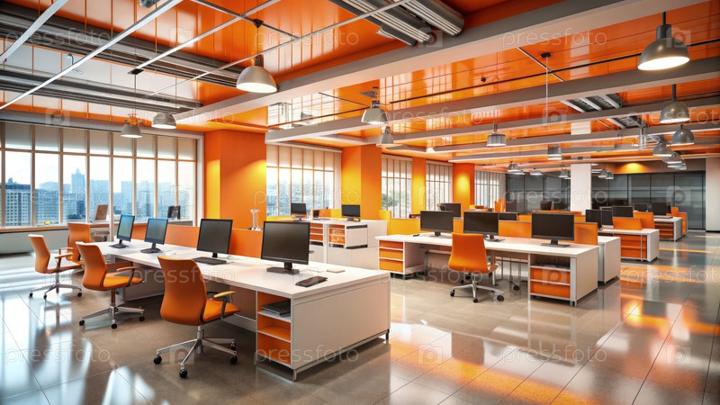 Настройка пустой редакции со столами и компьютерами в ярко-оранжевом декоре