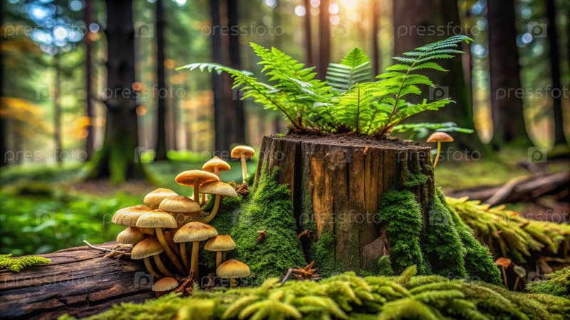 Близкий план ствола дерева, украшенного мхом, папоротниками и грибами в спокойном лесу во время золотого часа