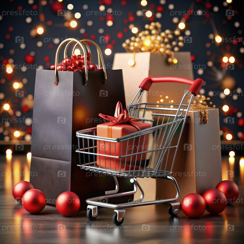 Торги для праздничных покупок и небольшая корзина, наполненная подарками, создают праздничную атмосферу во время распродажи в Черную пятницу