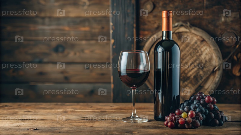 Наслаждаться красным вином в деревенской обстановке с виноградом на деревянном столе