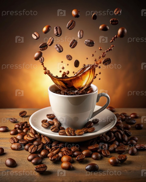 Кофейная чашка, разливающая богатый темный кофе в окружении разбросанных кофейных зерен на деревянной поверхности с теплым светом на заднем плане