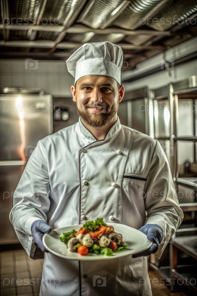 Шеф-генеративный ИИ представляет красиво покрытое блюдо из овощей на кухне ресторана