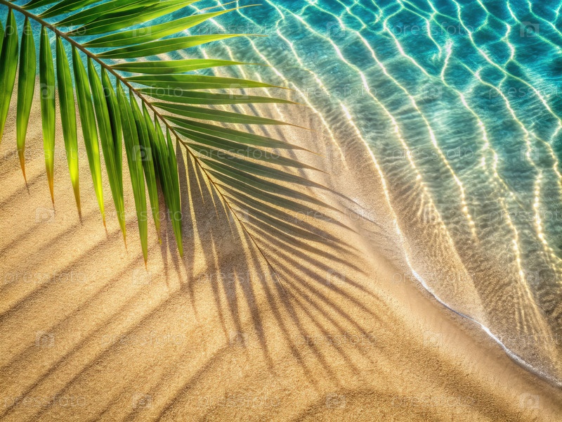 Пустой абстрактный пляж с тенью пальмовых листьев над золотым песком и чистой водой