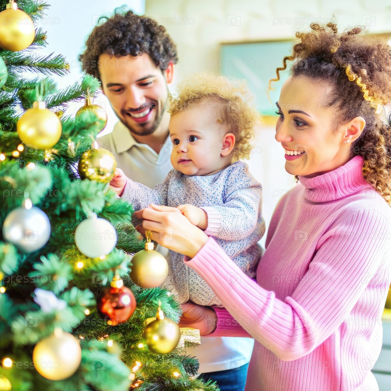 Семья украшает рождественскую елку радостным ребенком в уютной гостиной