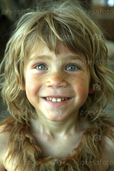 Счастливый неандертальский ребенок, тепло улыбающийся в доисторической природной обстановке
