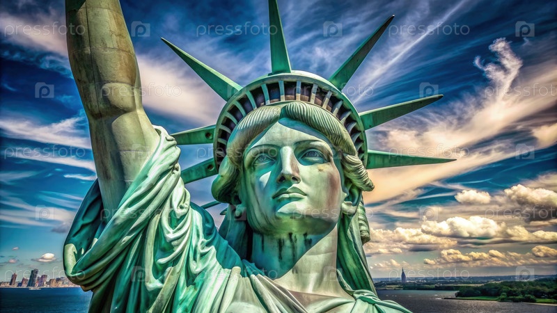 Уникальные перспективы Статуи Свободы против потрясающего неба днем