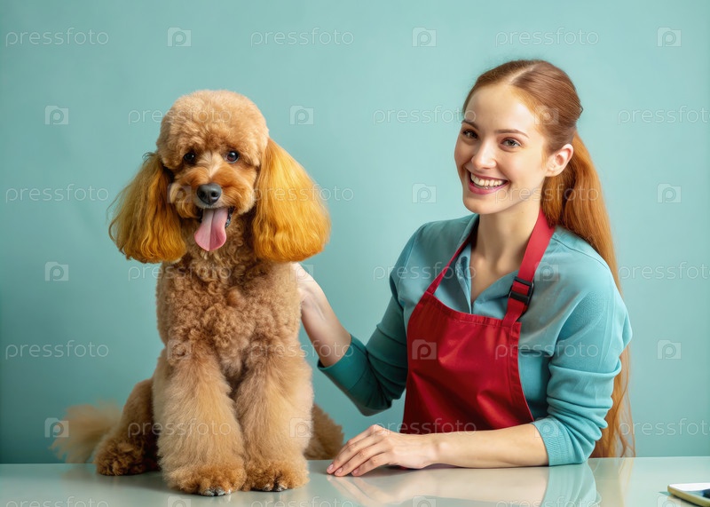 Счастливый уборщик собаки с пуделем в ярком салоне красоты