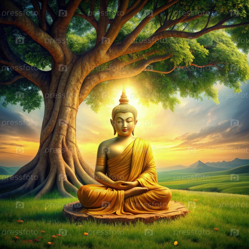 Спокойный Будда, мирно медитирующий под величественным деревом при закате солнца, излучает спокойствие и духовное просветление