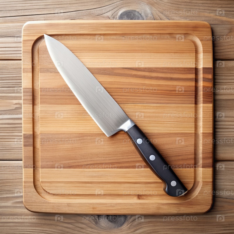 Свежеизготовленная деревянная доска для нарезания с острым кухонным ножом, готовая к кулинарной подготовке