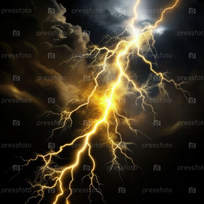 Драматическое изображение золотых молний, освещающих темное облачное небо во время грозы посреди ночи