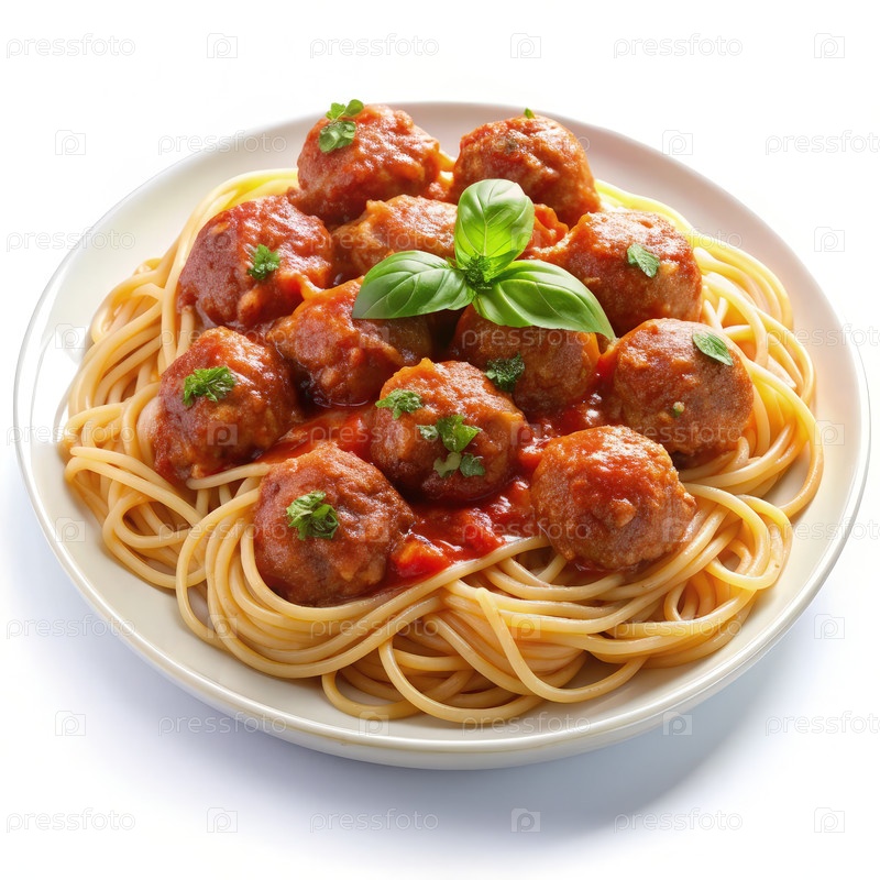 Тарелка спагетти с маринарным соусом и мясными булочками, украшенными травами