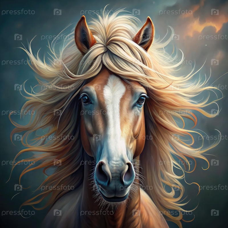 Гротескная лошадь с пушистой гривой позирует на драматическом небе при закате солнца