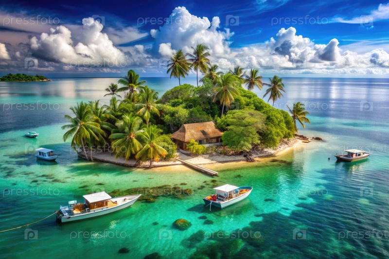 Островный рай с лодками в кристально чистых водах под ярко-синим небом