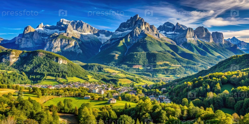 Впечатляющий вид на французский горный массив под чистым небом, демонстрируя пышные долины и очаровательную деревню в полдень