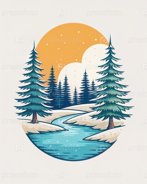 Спокойный осенний зимний пейзаж с закатом солнца над деревьями и рекой