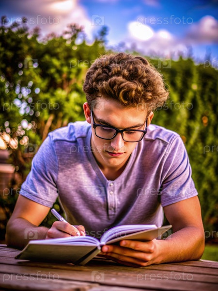 Студент учится на открытом воздухе, выделяя заметки для подготовки к экзаменам