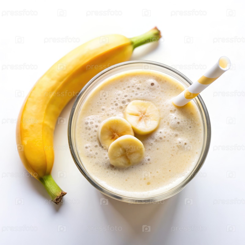 Кремный банановый молочный коктейль рядом со спелым бананом на белом