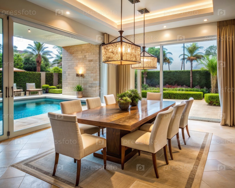 Элегантная столовая с большим деревянным столом и прекрасным видом на бассейн и сад в роскошном доме