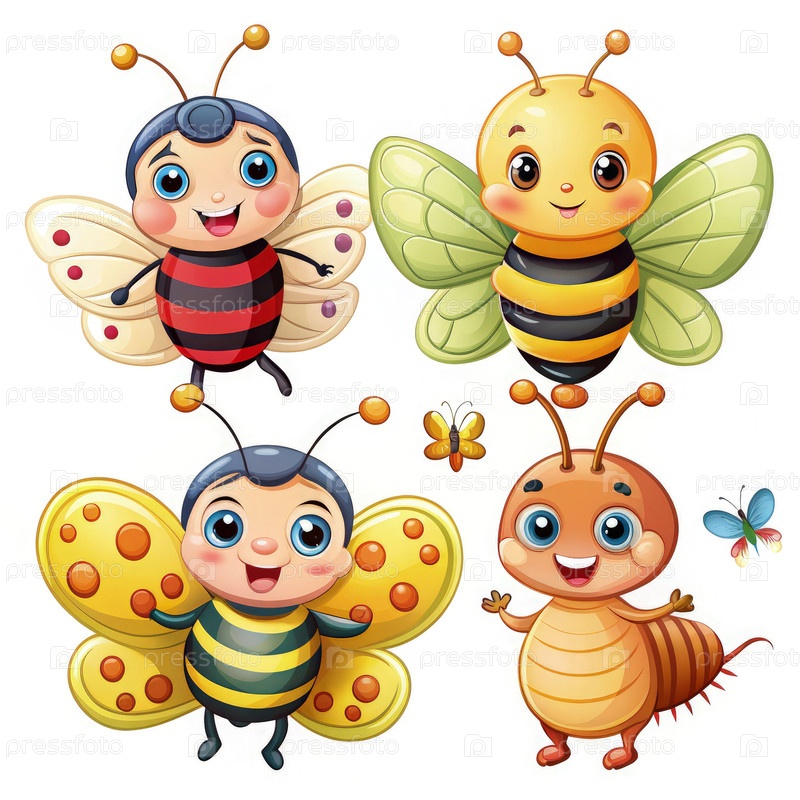 Милые мультфильмовые герои бобылицы, пчелы и бабочки в игривых позах